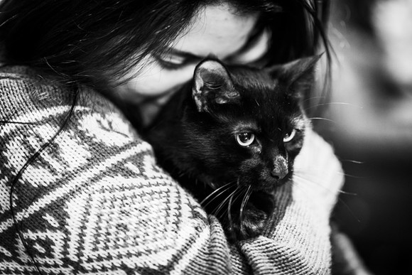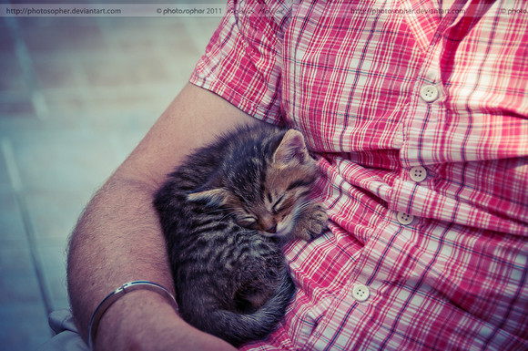 It's a sweet photo. The kitty with his(her) hug is cute but for some reason the most adorable thing is the torn clothing full of cat's hair.