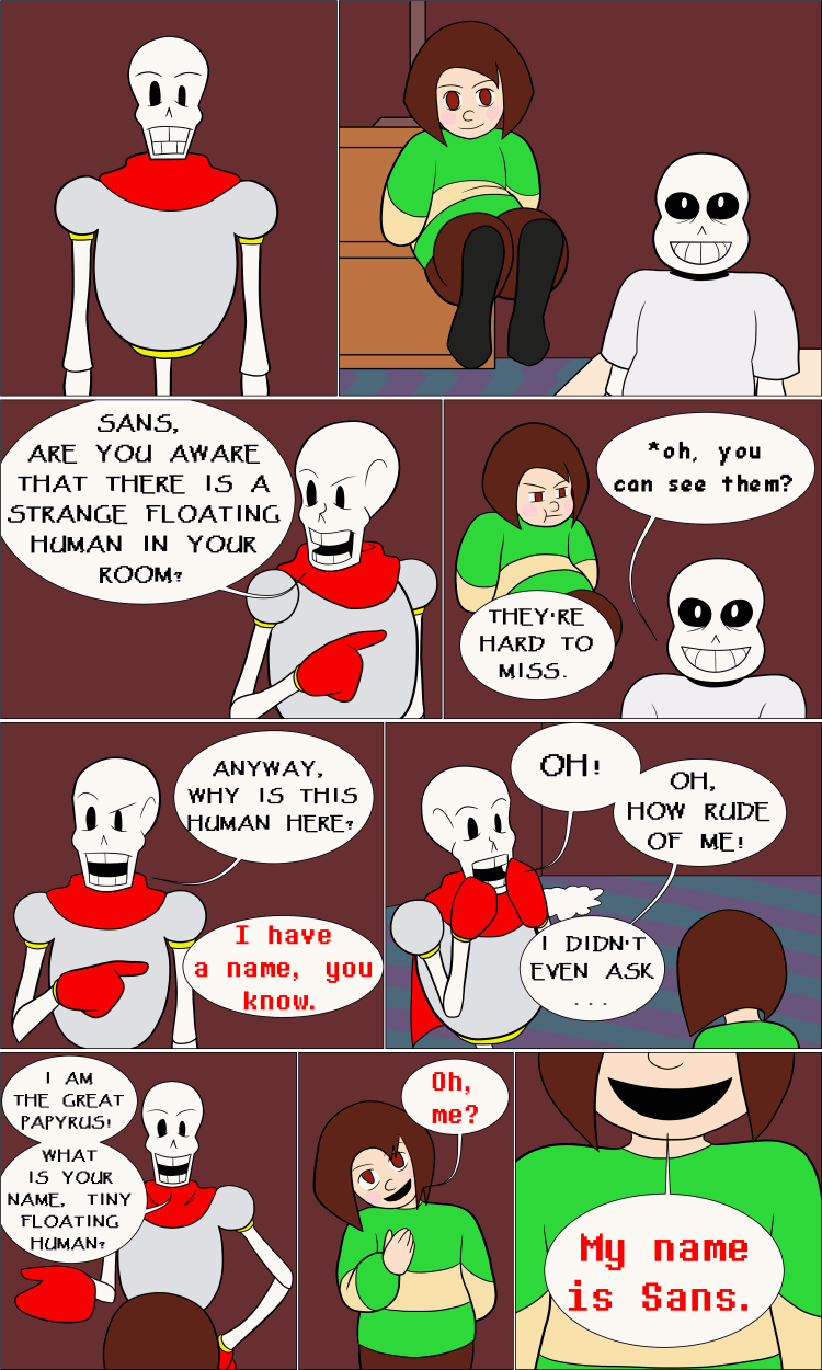 So this happened in my head yesterdayMystery Inc fell?... climbed?... from Mt Ebbot and some how "trapped" Papyrus thinking he was a guy in a skeleton costume and then accidentally pops Paps head off...