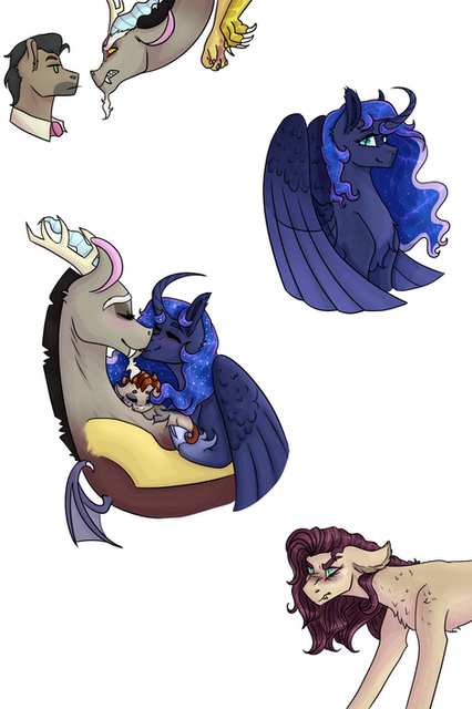 The draconequus bent his long neck to kiss his lovely wife on the head, drawing in the smell of her messily tied up mane. He had been waiting patiently all morning for her to return.
