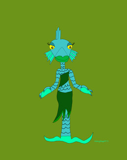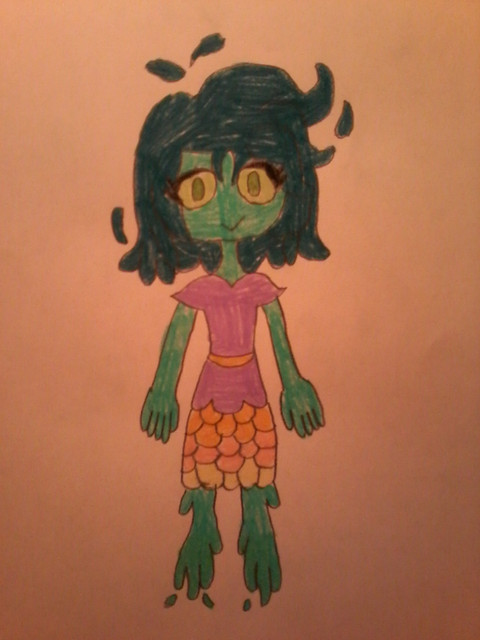 Description: A sea green sea monster with scales, Caribbean green webbed hair, webbed fins on the side of her head, skin parts, and a sea serpent tail. She has orange fish-eyes. She wears an ocean blue swim dress and slippers. Her jewelry’s a magenta necklace cuff and a purple and blue pendant necklace.