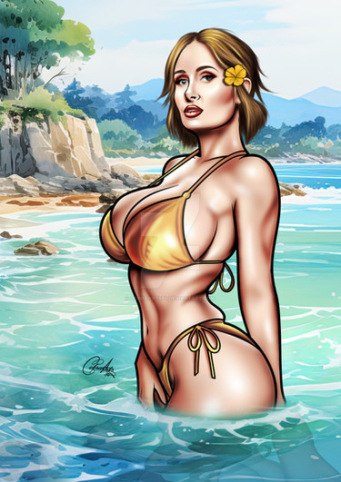#beauty #beach #body #digitalart #sea #glamour #bathing #bigbreasts #bikini #contrast #pinup #sexywoman #summer #sunset #water #wethair #semirealisticanime #swimsuitbikini