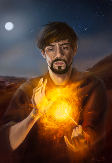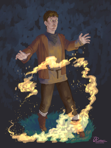 Persona work, digital.A man in a damage gambeson and shirt angrily prepares to launch a couple of magical fire bolts at an unseen enemy in the middle of a battle, his face bruised and cut.