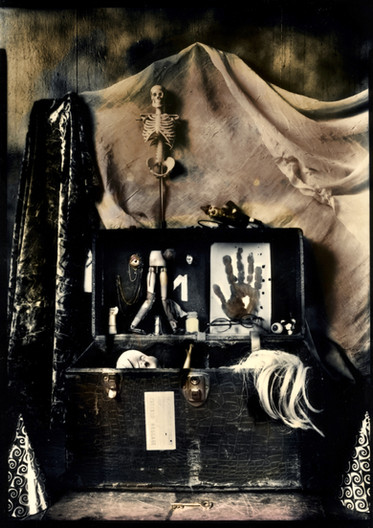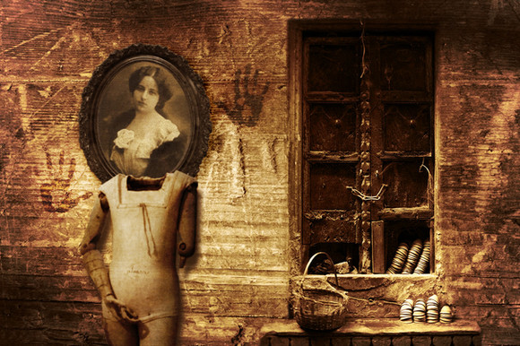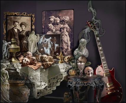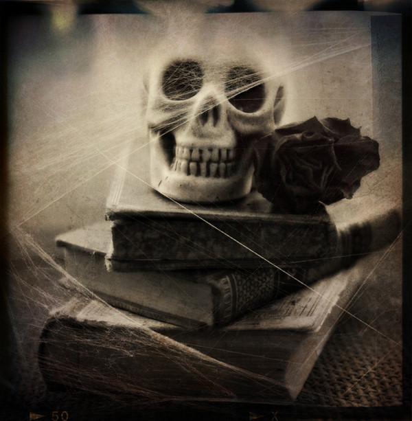 this is so beautiful - the old feel. the elements used. the colour tone. everything so fitting... details are so exquisite! [especially the wall texture and the almost invisible writings] it's interesting how you've included both life and death - skull and grapes. flowers not withered yet... hands which could symbolise creation. great work!