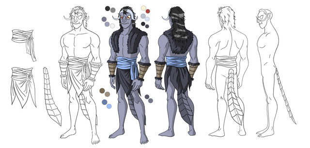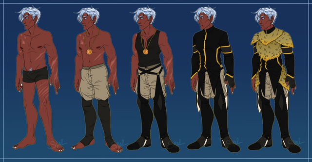 He wears a pair of tan trousers that cut off just below the knee as well as a long orange sash which he wears wrapped around his waist like a belt. He has a dark grey top with a high collar which he can pull up to hide the lower half of his face when he is sulking or trying to hide. He also wears a sleeveless hoody which is a slightly darker shade of grey.