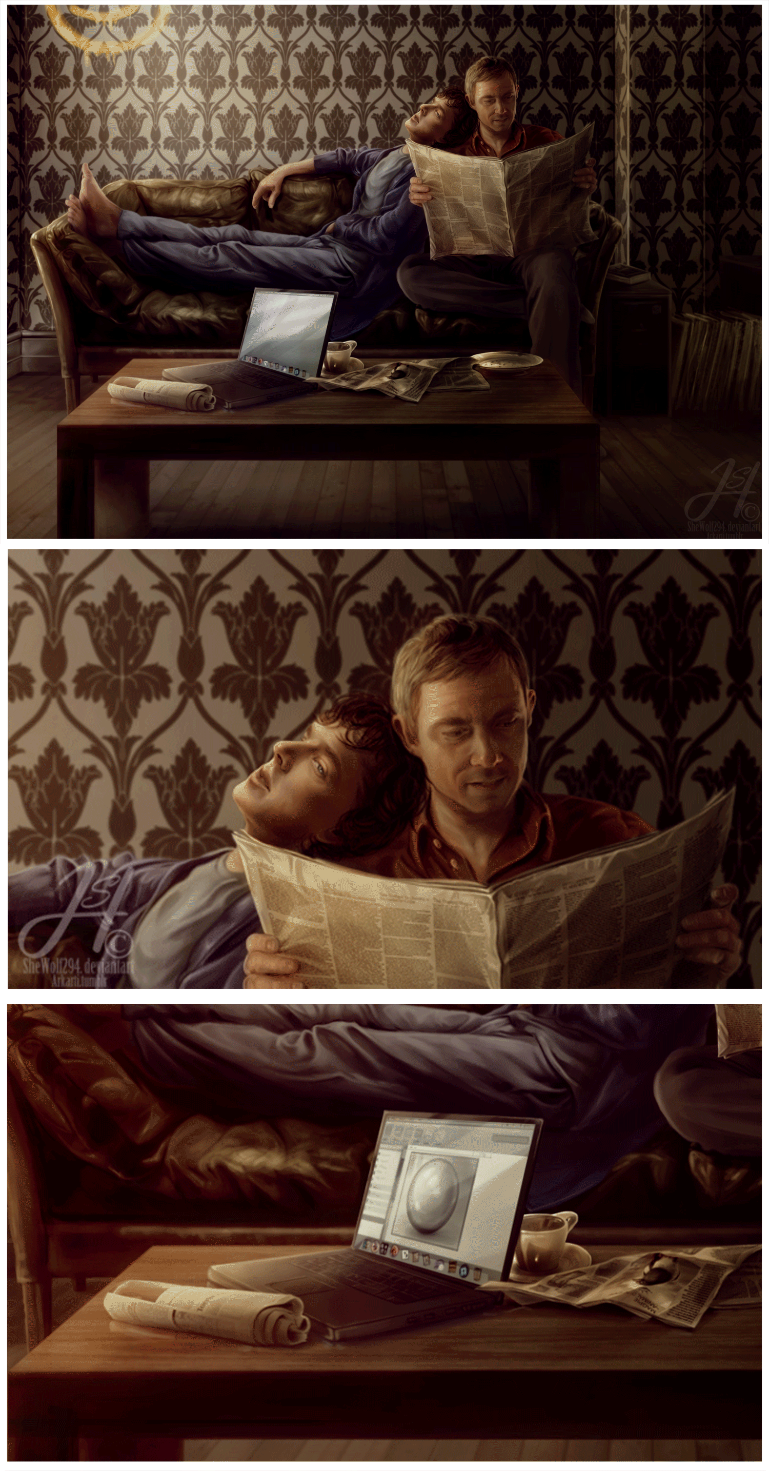 It's so brilliant I don't even know what to say. It looks flawlessly realistic. I love everything about it, the details, the stuff and clutter in the room, the lighting, the colours and I love their expressions. Everything about this is so perfectly Sherlock. I adore your art.