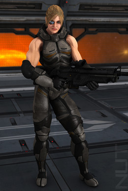 Satoru is a highly skilled space-craft pilot, tech and engineering expert. She has implants in her optical nerves and a robotic arm. Both are the result of a past accident, but they serve her very well now that she's in a F.E.A.R. team. Her primary weapon is the light particle rifle; energy based, accurate and lethal. She also has a shotgun with regular ammo for close quarters, and the standard issue sidearm.