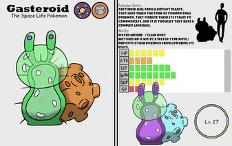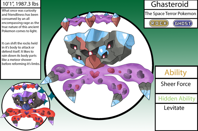 Ghasteroid, The Space Terror PokemonGhasteroid is the evolved form of Skulleor. What once was curiosity and friendliness has been consumed by an all encompasing rage as the true nature of this ancient Pokemon comes to light. It can shift the rocks held in it's body to attack or defend itself.