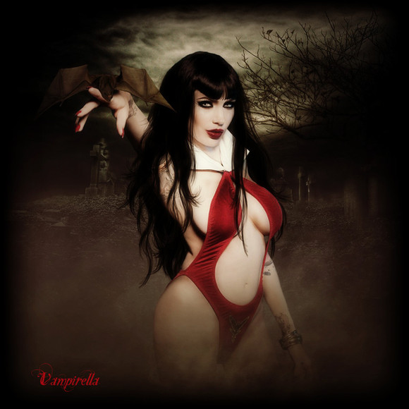The beautiful Vampirella ! The model is Malice from Beauty Destroyed ([link] ). All the costum is from scratch, except the leather armbands. The Background is from the video game "Vampire : The Masquarade - Redemption". I used element directly from the comic book to make the costumeRelated content