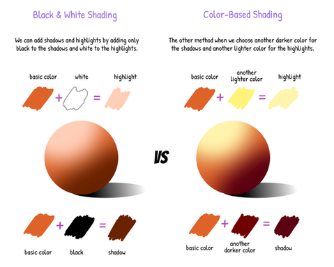 - if you dont have a background to choose colors from, the base shadow is usually a light purple (red on a yellow base), the shadow outline is usually orange-y, and the highlight is usually yellow or white.