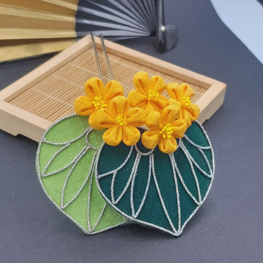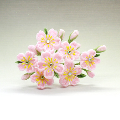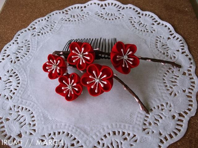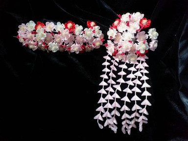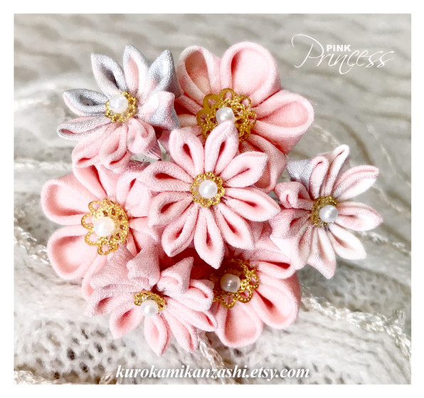 Today a lovely pair, though not necessarily a set, of cream and pink kanoko (false shibori) silk kanzashi. One is a comb (the smaller one) and the other a full-sized hair pin.