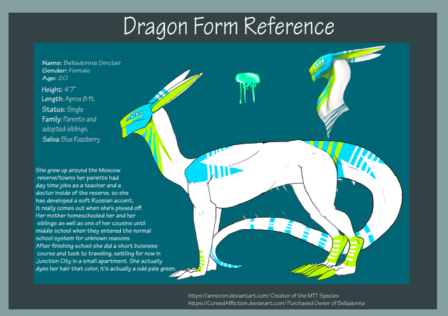 Appearance: He is a rather small dragon, if slightly smaller than most. Like all Metcele, he does not have particularly powerful forearms or limbs, and has powerful, large wings with membrane that stretches past the base of the tail and attaches to 3 cartilage spines. However, he lacks any of the patterning Metcele have as he is albino