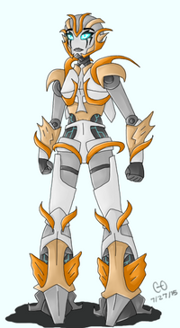 A small, light bot, aqua in color with magenta eyes and metallic copper accents. Alt mode is a small, sleek custom motorcycle, in her robot mode she's not even as tall as Arcee.