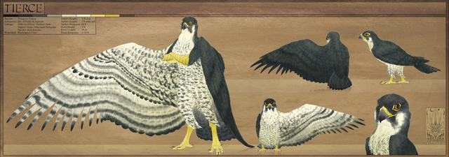 Appearance: Her front half is similar to a Lanner-Peregrine, in beak shape, talons and markings, however she has a feathered crest that starts at the top of her head and follows all the way down to the base of her tail. Her eyes are a brilliant green color.