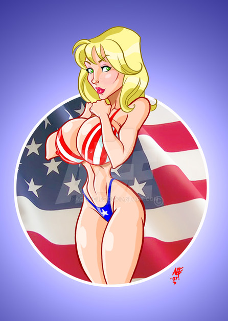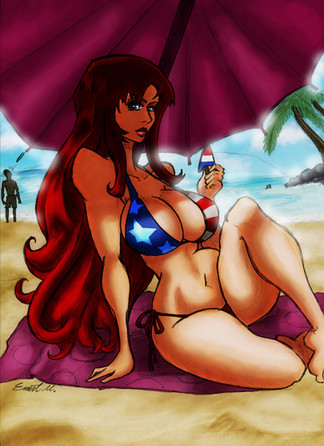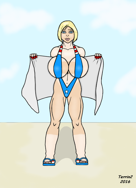 A superheroine that goes by the name of Cass. Having a nice day out at the beach in her brand new stars n stripes slingbikini.A commission for A character of their creation.