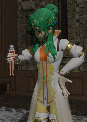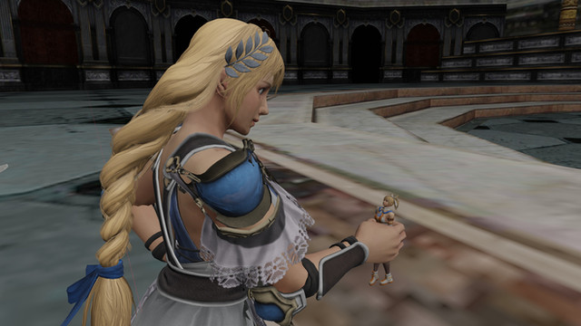 Alone, and shrunken to such a small size, Sophitia's quest now seemed doomed to failure. What she had not realized however, was that she had been followed by her sister from the very start. The similarly stunned Cassandra sought Sophitia's attention, but wasn't sure how without frightening the diminutive woman...