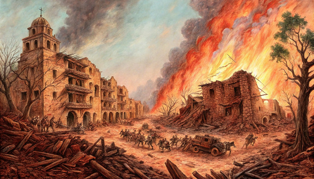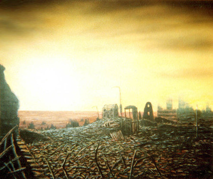I painted this as a companion piece to "28 Years Later". This was inspired by Chapter 5 of John Christopher's novel "The White Mountains", a story that was itself inspired by H.G. Wells' "War of the Worlds". "The White Mountains" is the first book in the "Tripods Trilogy", set in a future where the earth is enslaved by alien invaders, cities have been destroyed, and society has regressed to a medieval level. John Christopher has often been compared to John Wyndham because they've both been known to write post-apocalypse stories. Although post-apocalypse stories are common in SF, artists have been destroying cities for centuries. in 1796 Hubert Robert painted a view of the Louvre art gallery in ruins. in 1798 Joseph Gandy painted the Bank of England in ruins. In 1871 Gustave Dore' did an engraving called "The New Zealander" which shows a man sketching the abandoned ruins of London in the 21st century. Maybe destroying cities is an unconcious way of expressing a desire to escape the civiization we're trapped in. A lot of kids have fantasies about demolishing their schools.Related content