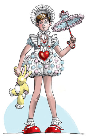 I love your superb artwork especially the fabulous sissy outfits like these. My own favorite to win is the second wuss from the left. The one with the beautiful parasol. When (if!) he wins I'd take him back to his all-boy junior high and let him get re-aquainted with all his old school mates. It's the least I could do after all the help he's given to the Girls' Academy! Yes, and it would make a delightful design for a mug.