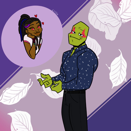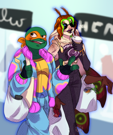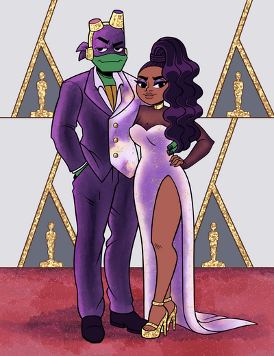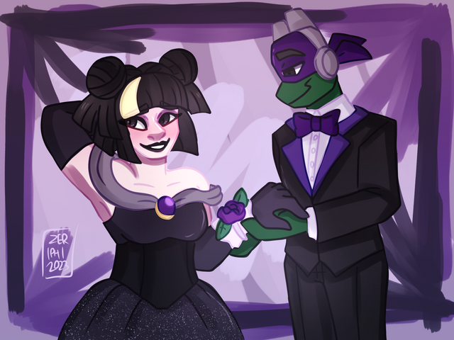 They are so funny as a couple I honestly think they would go so well together it's my number 1 ROTTMNT ship idcKendra's dress+ hair are inspired by modern runway takes on the Indonesian Kebaya. Also in her hair are Jasmine flowers which in Indonesia symbolize sincerity and purity and WEDDINGS (haha). The corsage and boutonniere are purple Delphinium, which are toxic (haha get it, bc they’re enemies), but Donnie bioengineered them to be harmless.