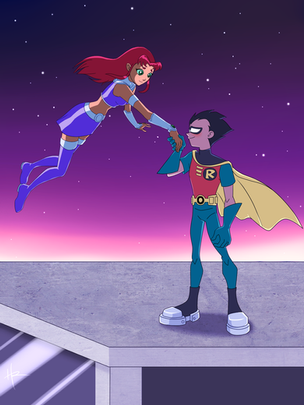 Awesome representation here! You really captured the atmosphere of the alien planet, with the warm colors and rocky peaks; that's what I remember about the design, that lava field, and your color choices absolutely conjure that memory. I like how you caught the moment where Star gets her powers back enough to fly them to safety, and the smiles are so precious and genuine! Your art is always so inspiring, and I love that you're constantly testing yourself. I think the poses came out great, the way Starfire is almost flying at the camera (man, that foreshortening, and with a leg bent under!), while Robin is pulled, kinda trailing, along behind as a passenger. Very well done!