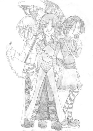 The character in the middle in white is I, and of course there's Neo and Trinity. It's just supposed to be a kind of Clamp-ish feel. Or something.