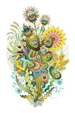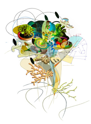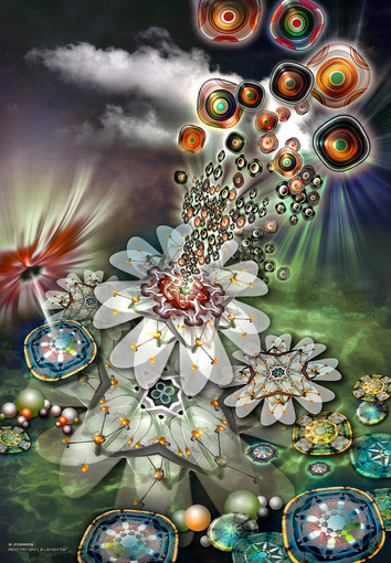 I usually don't like digital art, but happening upon this... Wicked awesome job. I love the watery-sort down, the sky and clouds upwards, and the flowers , or whatever they are, and the clash of styles between them. Imagination-full!