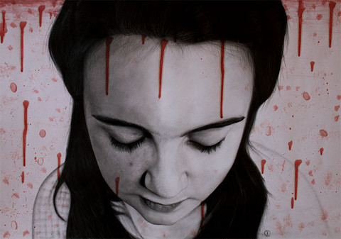 Great piece! I love the almost violent use of red combined with the placid, ghostly grey/blue tones on her face. Excellent work.