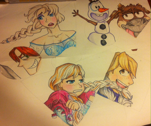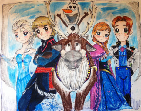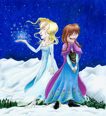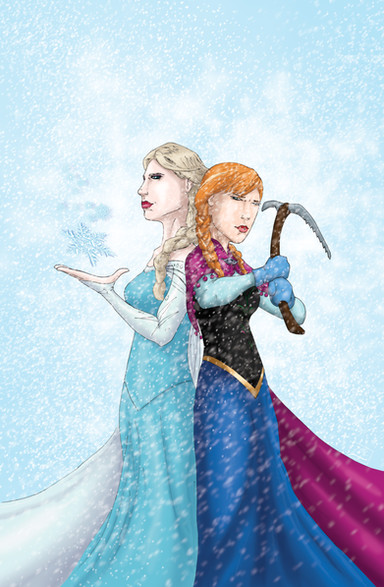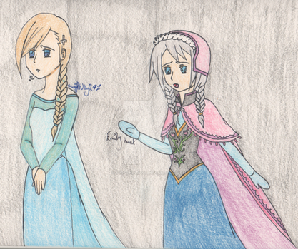Yes, apparently early spring can be quite chilly for our vibrant princess, but not for our cool queen of Arendelle.I really wanted to experiment on my taste of fashion in this drawing. I modernized Anna's outfit by giving her a scarf that is based off the cloak she wore. For Elsa, I mixed her ice and coronation dress with pointy snowflake patterns.