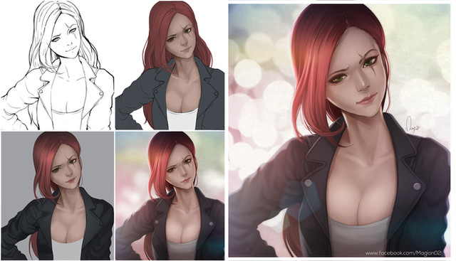 5) Continue to expand the value range of her face, add in the cast shadows and highlights.