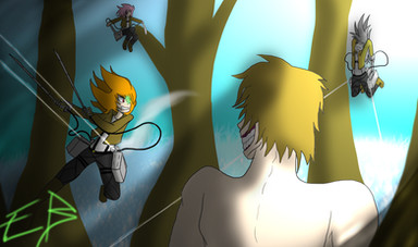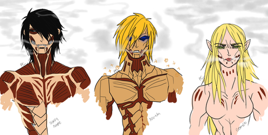 So here we go, drawing done for , our trio as titans from SnK.is looking at bunny, kinda hard to see, cuz they are so small compared to titans ;c.