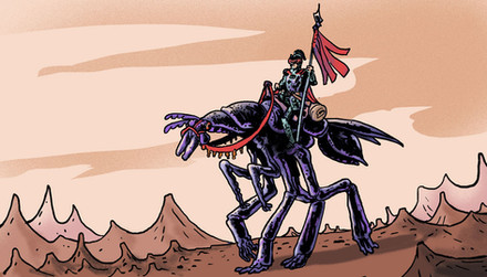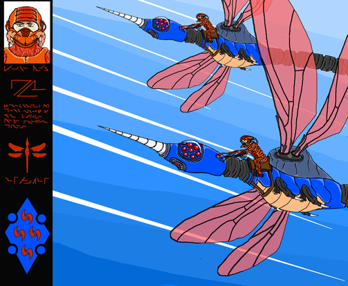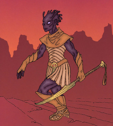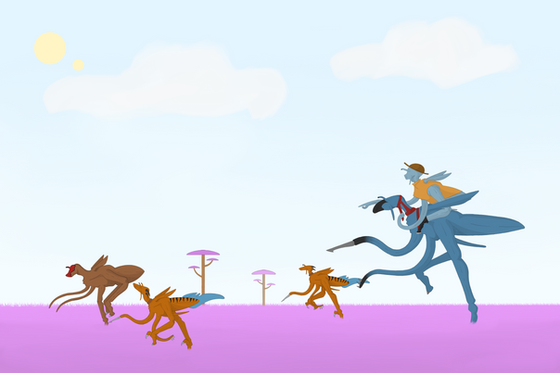 Acutally, there are three "wilder" relatives. There are herds of wild lyripedes that roam the uncivilized regions, but they are even more skittish than the domestic versions, and almost impossible to train. There's also a smaller, more gracile species called volapedes which dwell in the open grasslands atop the plateaus, very much like antelopes in the African savanna. They're faster, but too small to carry anything but the lightest riders and so skittish that they're almost entirely useless for domestication. The other species is the tantipede, which is only slightly smaller in mass, but differently proportioned. They are stockier, being slightly smaller with proportionally shorter legs, but longer bodies. Their heads are longer and larger and they give a nasty bite if cornered, in addition to producing a sharp-smelling musky spray for defense. These insectoids live in the thick jungles that cluster the edges of the great canals, browsing on the heavy foliage there. They are sometimes bred with lyripedes to create a more sturdy stock (commonly called vidapedes or vidas), but they often prove to be extremely moody and sometimes continue to nip and bite. They also retain their wild relatives' stink-glands, which cannot be easily removed without seriously injuring, so they are not preferred except for bearing burdens up and down the winding, rocky paths that lead from the lower jungles up to the plateau tops.