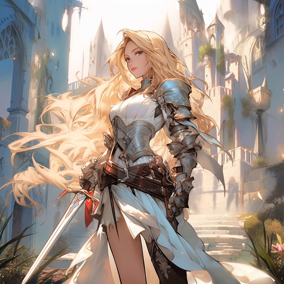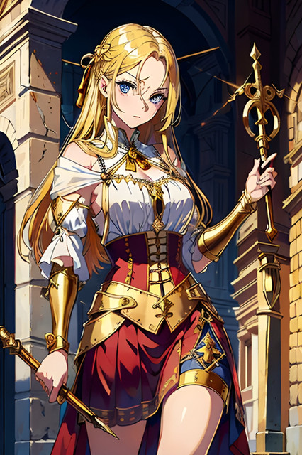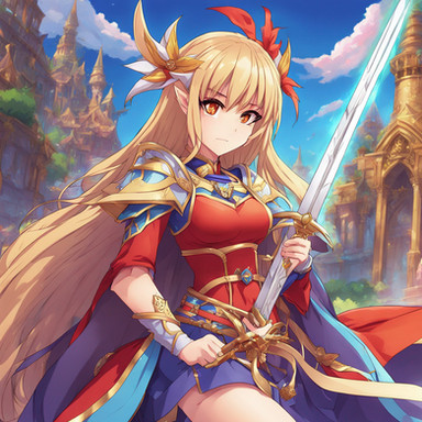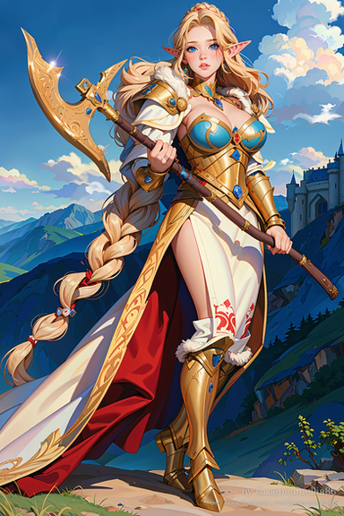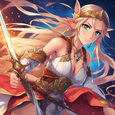 #anime #girl #ornate #aiart #armour #blondehair #cape #dagger #digitalart #elfears #elvengirl #jewelry #sword #goldarmor #highelffemale #stablediffusion