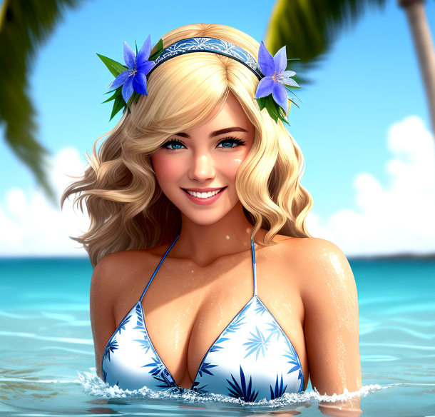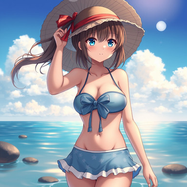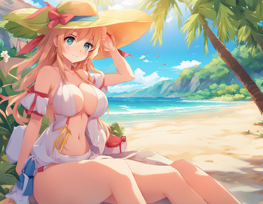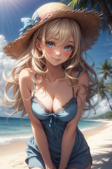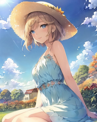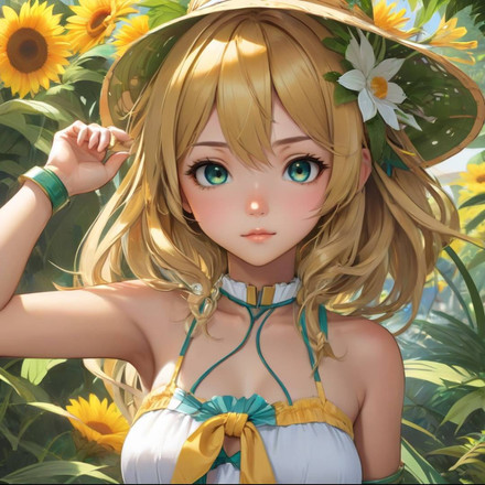 #anime #colourful #cute #girl #summer #aiart #blondehair #digitalart #floraldress #sandals #smile #squatting #strawhat #summerdress #aiartcommunity