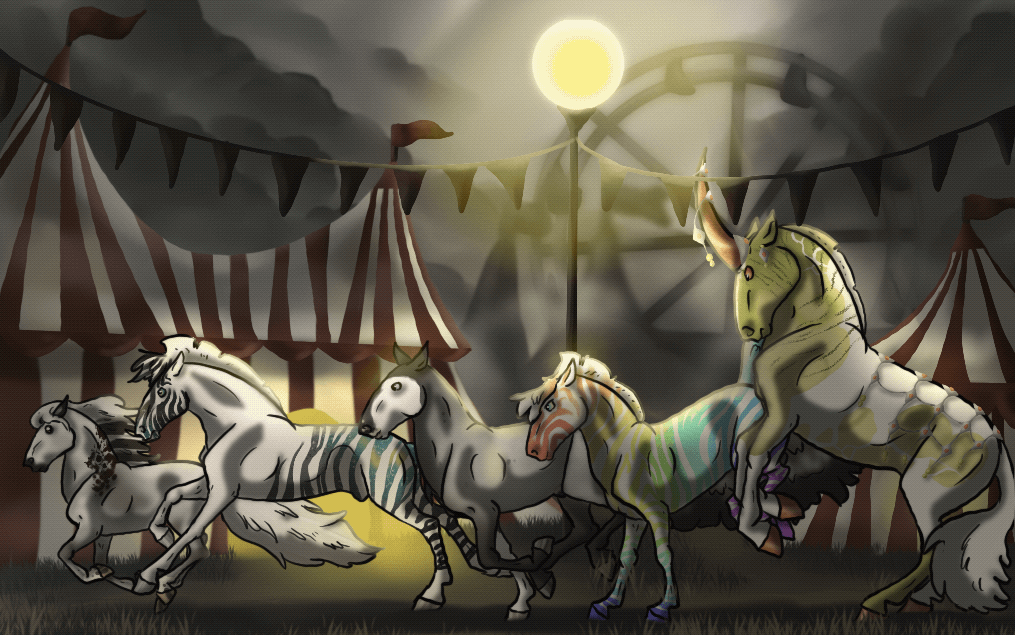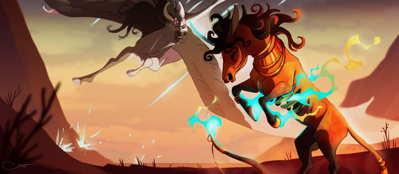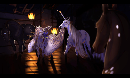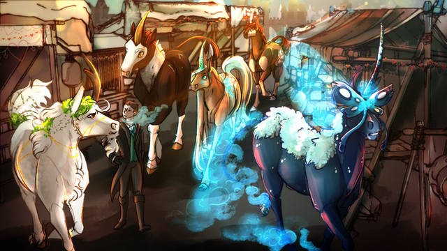 While exploring the markets on the Gilded Bridge, an unusually ghost-like stallion caught his eye. The bridle he wore proved his wealth, but his glassy blue eyes made Bix especially uncomfortable; he was eyeing Newt and Cricket.