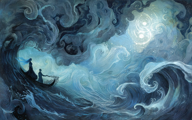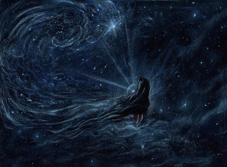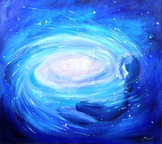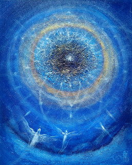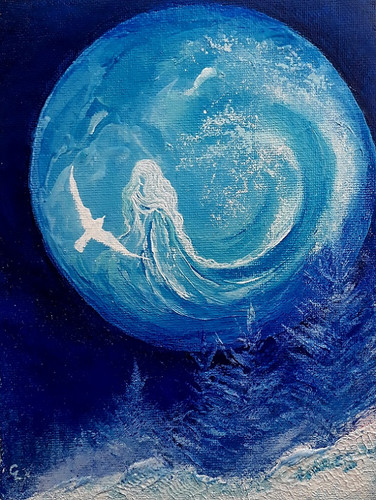 Ooh, wonderful impact! It's like diving into a magical whirlpool, all those rich hues of blue... And the white figure and white specks like snow add to the peculiar sense of space and movement. I come to think of diving deeper within through illusions, but that may be just my association. It makes me feel oddly inspired and uplifted. Do you ever sell your paintings? I think I could spend a whole lot of time looking at your work.