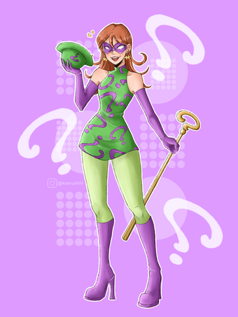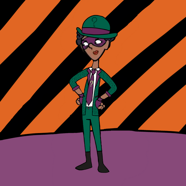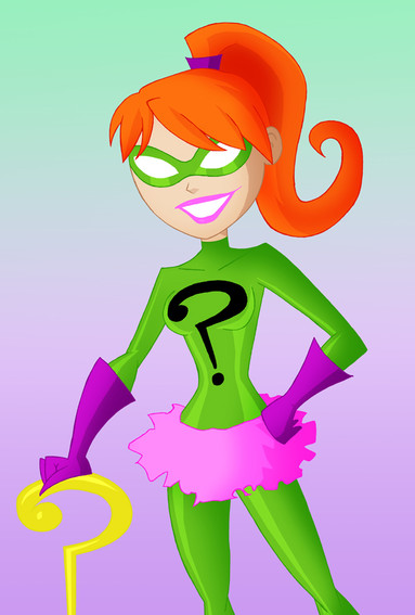In my take, Edward Nigma (now Edna) is a foe for Robin to face — both in and out of costume. She is a child prodigy who goes to his school. Both are always getting on eachother's nerves. Edna is extremely smart and has grown the habit of puzzle solving anything and everything to the point of obsession. One being the greatest mystery of all. Who is Batman? Has a double-life where she commits crimes (not big crazy ones, but big enough to grab Batman and Robin's attention) as The Riddler. Usually he sends Robin to deal w/ her.Her costume is homemade and her ponytails meant to resemble the “?”. Character wise, I’d have a few personality traits/quirks and energy similar to Jim Carrey’s portrayal, only greatly dialled back of course. Maybe a bit more peppy.