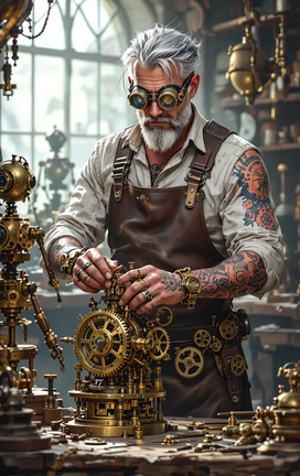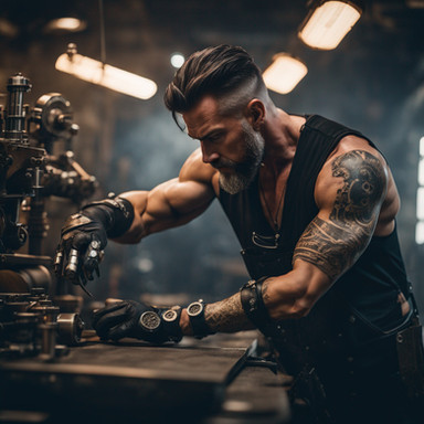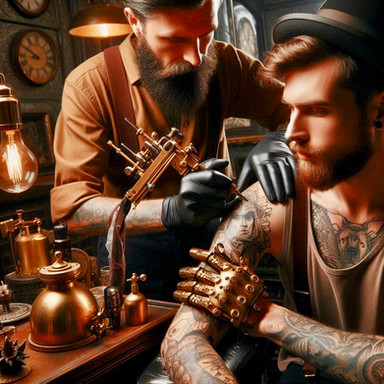 #steampunk #tattoo #arm #artist #brass #clockwork #detailed #gears #gloves #goggles #ink #leather #machinery #mechanical #metal #needle #retro #tools #vintage #workshop #midjourney