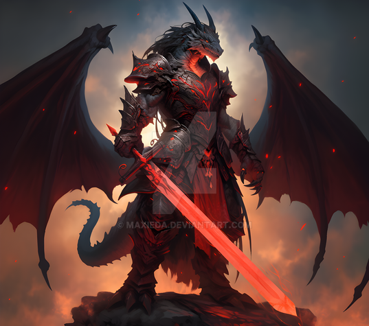 #armor #beast #concept #dark #desolate #dragon #fantasy #gauntlets #horns #knight #landscape #mountain #red #sky #tail #warrior #wings #art #fire #midjourney #midjourneyart #midjourneyv6