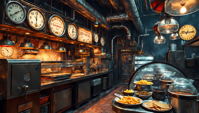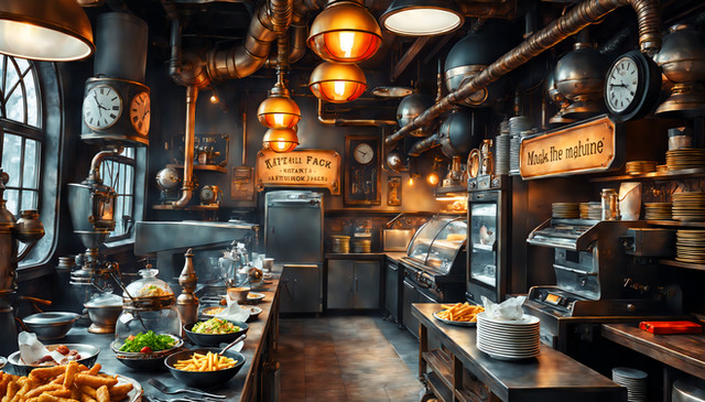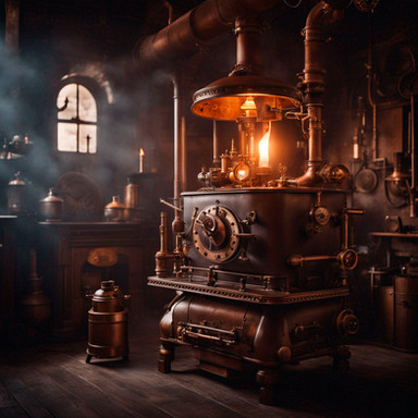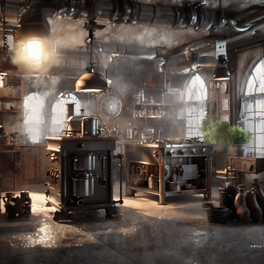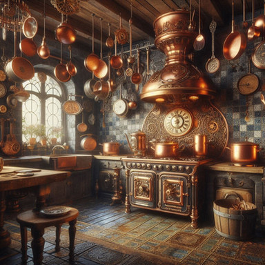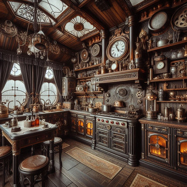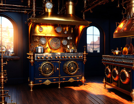 #architecture #steampunk #vintage #antique #clock #clockwork #copper #design #detailed #fashioned #industrial #kitchen #mechanical #pans #pipes #pots #retro #rustic #stove #warm #old #midjourney