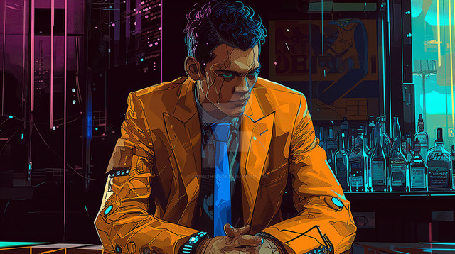 #brooding #caramel #dapper #defiant #electric #glowing #mysterious #neon #night #reflective #sharp #solitary #suit #urban #whispers #skyblue #midjourney #midjourneyart #midjourneyv6