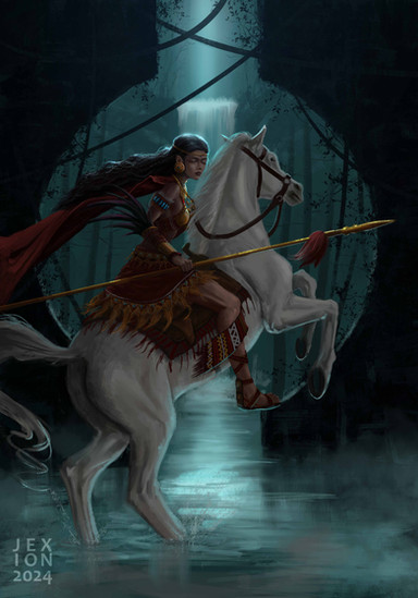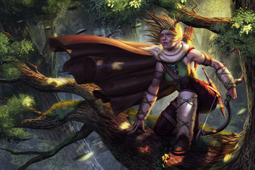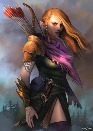 Created March 5, 2021This illustration is my 2nd attempt to DnD fantasy theme character. An Elf Ranger - the concept I thought is to make her blend with nature with out special/magical effects. There, she stands atop a large tree on watch.