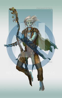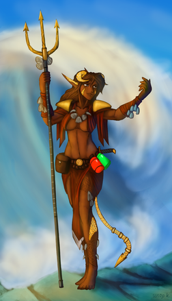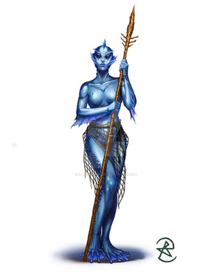 Client's description:Iridansa Oromae - Sea Elf Ranger – Female – Blue Skin, Green Hair. Armed with a Silver Trident, carries a number of knives. One on each hip and a cross sash with 4 others. Has a necklace of dolphin -allows for breathing on land. If we could do the drawing with her coming out of the ocean.
