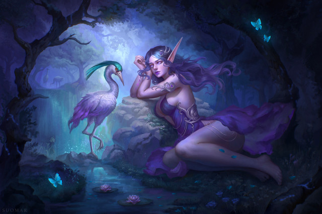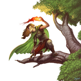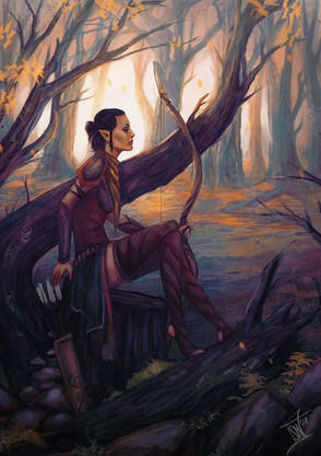 About this artwork, I was mainly thinking of a wild elf blending with the trees. I was also focused on the lighting of the character and background. The clothing and tattoos are really into a wild elf design adding a war paint that makes her a fearsome warrior.