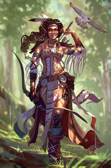 Wild Elf Ranger/Arcane Archer – Female – Long black hair midback length with feathers in it. Tattoos on arms. Carries an Elven Bow has a short sword and hand axe an a number of knives. Dressed in leather (think of Plains Indians for an idea of the dress and look).