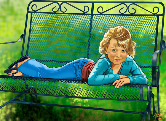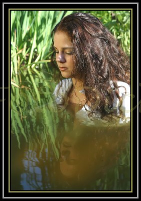 Studio shot of step-daughter. Background of stream wallpaper.Related content