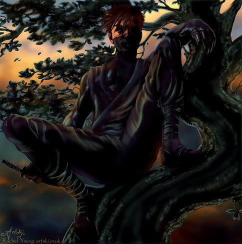 My first time colouring in photoshop CS, as opposed to 5.5 which I usually use. I feel more comfortable with 5.5, CS is weird and awkward and I hate it >= P However, I love the way you can make your own brushes, with different angles and stuffies^^ The skin pores, hair some of the leaves and even the crosshatching on the cloth, were all brushes I made specifically for this pic.