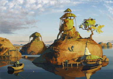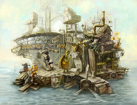 I love the contrast between the huge, futuristic buildings in the background, and the humble buildings and boats in the foreground. The colour pallet does a very good job of emphasising the disconnect there. Very beautiful.