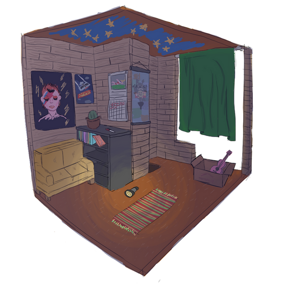 This is basically an interpretation of a corner of my room, except that isn't my radio, the shelf with the radio is actually a sink, and it's WAY less messy than my room.