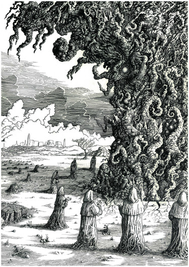 TOON VORTEXA dimensional portal opens from another universe, cartoon characters emerge from it, they are recognisable but are seem different to our eyes. This piece was fun to draw and captures a queasy joy for comic/puppet characters.