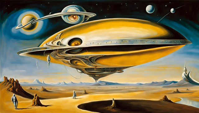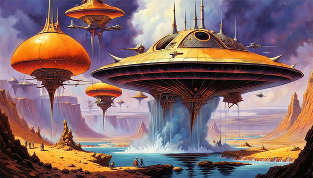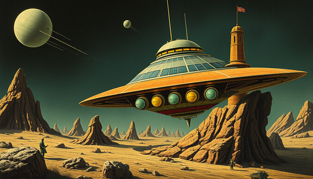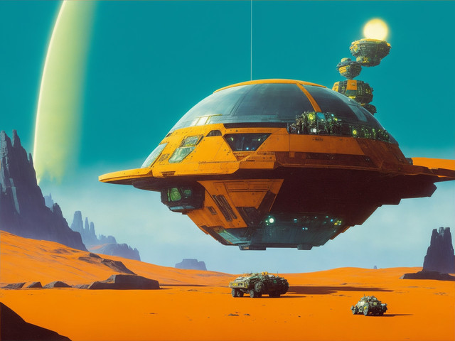 #alien #car #future #landscape #nature #painting #planet #scifi #spaceship #aiart #futuristic #illustration #mountains #mountainscape #retrofuturism #retrofuturistic