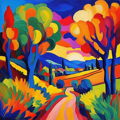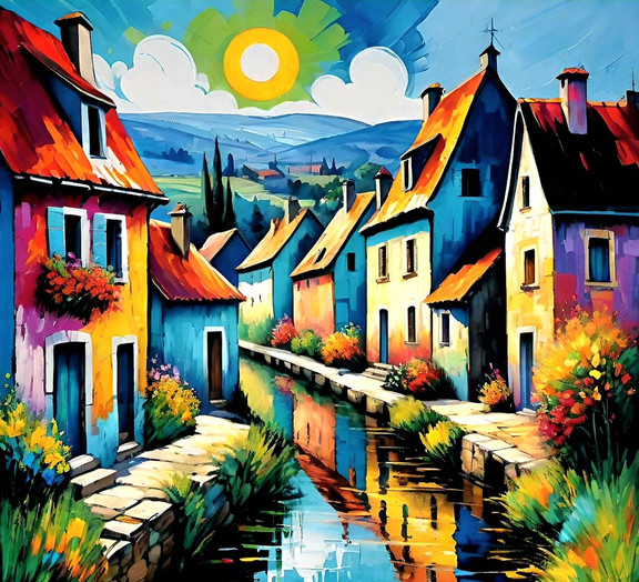 #colorful #fauvism #nature #painting #river #rural #sunset #trees #village #water #aiart #illustration #landscape #mountains #mountainscape #oilpainting